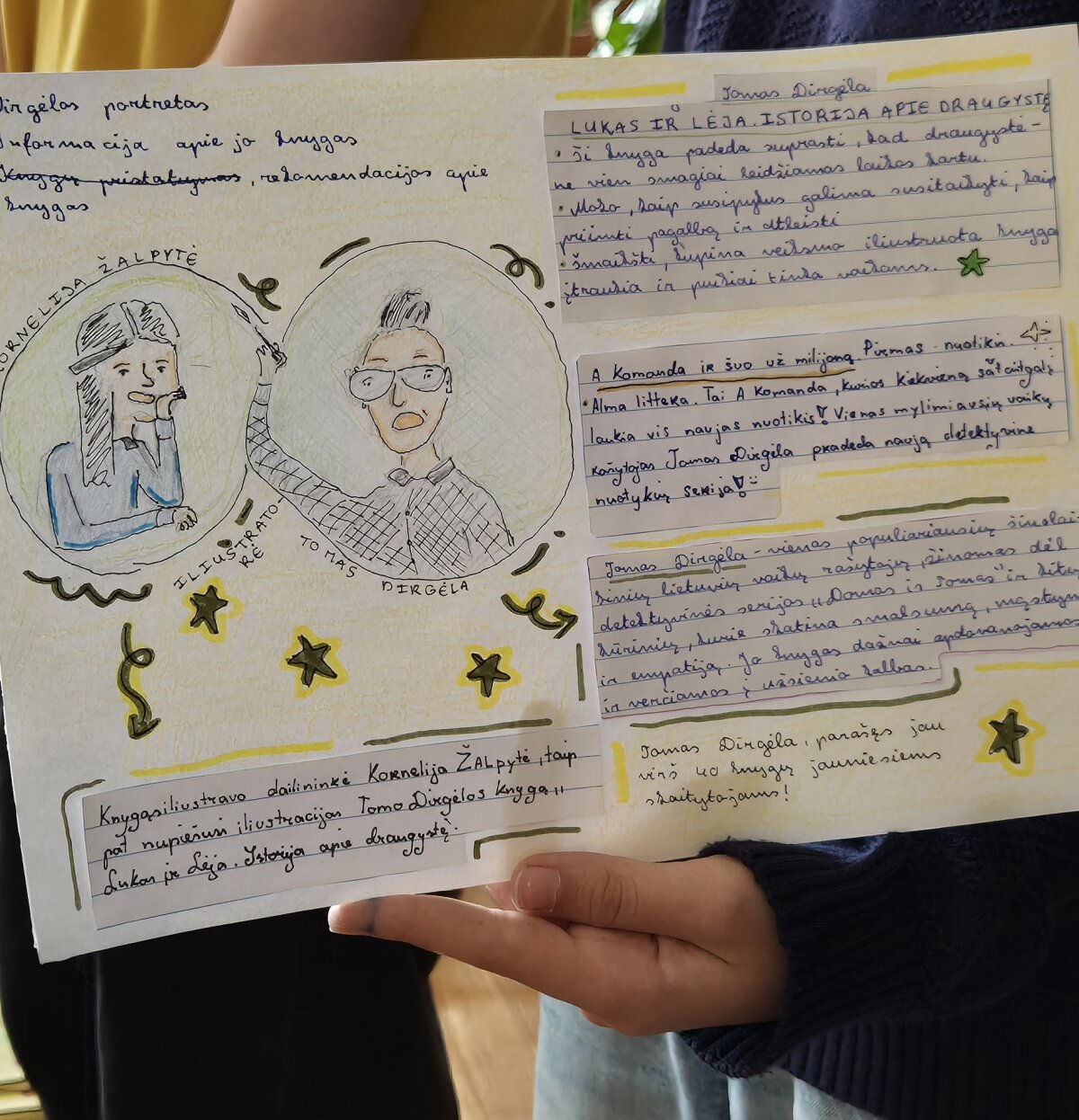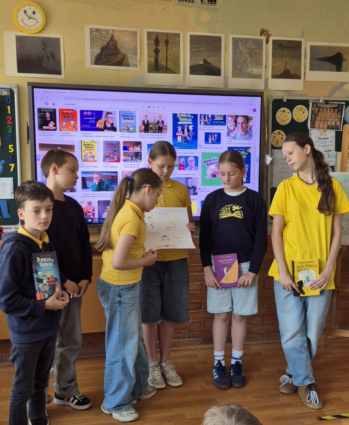 Birželio 3-ioji 4c klasėje buvo ypatinga diena – kūrybiniai skaitymai „Diena su Tomu Dirgėla“, skirta pažinti vieną populiariausių šiuolaikinių vaikų rašytojų. Į veiklas aktyviai įsitraukė ketvirtokai, kurie ne tik skaitė rašytojo kūrinius, bet ir gilinosi į jo asmenybę bei kūrybos užkulisius. Pagrindinis šios dienos akcentas – nuotolinis susitikimas su pačiu Tomu Dirgėla. Mokiniai turėjo galimybę gyvai pabendrauti su autoriumi, užduoti jam klausimų apie rašytojo kelią, kūrybinį procesą, kasdienybę ir, žinoma, mėgstamiausius personažus. Rašytojas su mokiniais dalinosi įkvėpimo šaltiniais, pasakojo, kaip gimsta jo knygos, ir padrąsino vaikus nebijoti kurti patiems. Prieš susitikimą ketvirtokai ruošėsi atsakingai – skaitė Tomo Dirgėlos knygas, iliustravo pasirinktus epizodus, dirbo grupėmis, kūrė pristatymus apie knygas ir jų veikėjus, rašė rekomendacijas kitiems skaitytojams. Tokiu būdu mokiniai ne tik lavino skaitymo ir kūrybiškumo įgūdžius, bet ir mokėsi bendradarbiauti bei reikšti savo mintis. Diena su Tomu Dirgėla paliko daug įspūdžių ir suteikė įkvėpimo. Vaikai patyrė, kad knygos – tai ne tik puslapiai su žodžiais, bet ir nuotykiai, vaizduotė, juokas bei kūryba. Ačiū Tomui Dirgėlai už šiltą bendravimą, o ketvirtokams – už kūrybingumą, smalsumą ir aktyvų dalyvavimą!