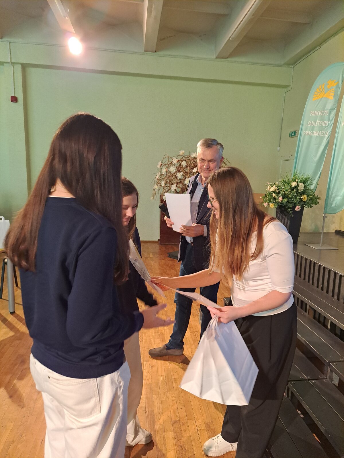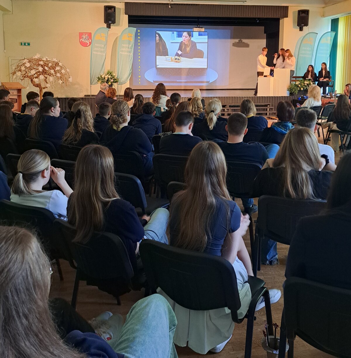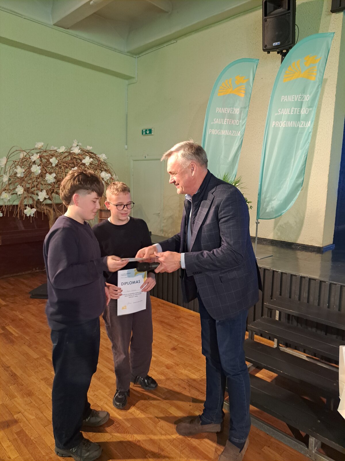 Birželio 12 dieną progimnazijoje vyko neeilinis konkursas, kuriame dalyvavo garbūs svečiai. Robertas Dargis, verslo šou „Rykliai. Lietuva“ komisijos narys, Lietuvos nekilnojamojo turto plėtros asociacijos prezidentas, dalinosi savo įžvalgomis apie tai, kad sėkmingu verslininku gali būti ne kiekvienas, o pagrindinis dalykas siekiant juo tapti – gera iškalba ir tikėjimas tuo, ką darai. 22 verslumo projektiniai darbai buvo pristatyti komisijai, kuri išrinko tris geriausius. Jaunieji verslininkai pristatė savo sukurtas verslo idėjas, kurios gimė verslumo ugdymo pamokų metu. Šiam projektui įgyvendinti buvo skirti 5 etapai. Kiekviename iš jų mokiniai turėjo galimybę susipažinti ir padirbėti įvairiomis verslumo ir ekonomikos temomis: verslo idėjos kūrimas, jos realizavimas kuriant prototipą, rinkos tyrimo atlikimas, prezentacijos rengimas ir, aišku, viešosios kalbos meno mokymasis. Lietuvos Junior Achievement direktorės Andželikos Rusteikienės pozityvi ir įkvepianti kalba apie antreprenerius mokykloje mokiniams suteikė galimybę pamąstyti, kaip jaunuoju verslininku galima tapti dar mokyklos suole. Progimnazijoje besikuriančios jaunosios mokinių bendrovės tik įrodo, kad tai visiškai realu įdedant daug darbo, pastangų ir noro siekti užsibrėžtų tikslų. Komisijoje dirbo ir Panevėžio švietimo centro direktorė Asta Malčiauskienė, kuri negailėjo klausimų projektinius darbus pristatantiems septintokams, taip paskatinusi mąstyti apie ateities planus. Šiais mokslo metais I vietą konkurse laimėjo 7b klasės mokiniai Jokūbas Š. ir Tajus G., pristatę projektinį darbą „Daugiafunkcinis dronas“, II vieta paskirta 7d klasės mokinėms Otilijai B. ir Liepai B. su projektiniu darbu „Šalikas su atšvaitu“, o III vietą laimėjo 7a klasės mokinės Miglė S. ir Agnija S. su projektiniu darbu „AQVA BLOOM“. Sveikiname nugalėtojus! Ačiū mokytojai Agnei, visiems, kurie prisidėjo prie šio konkurso ir dar kartą įrodė, kad Panevėžio „Saulėtekio“ progimnazijoje auginamos verslo idėjos augina ir dideles asmenybes!