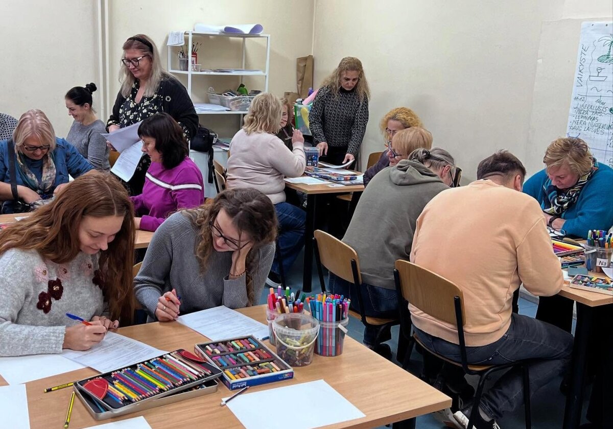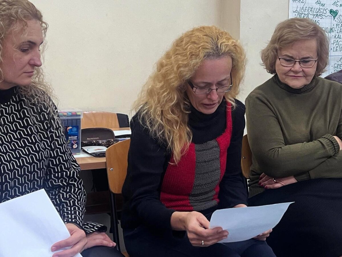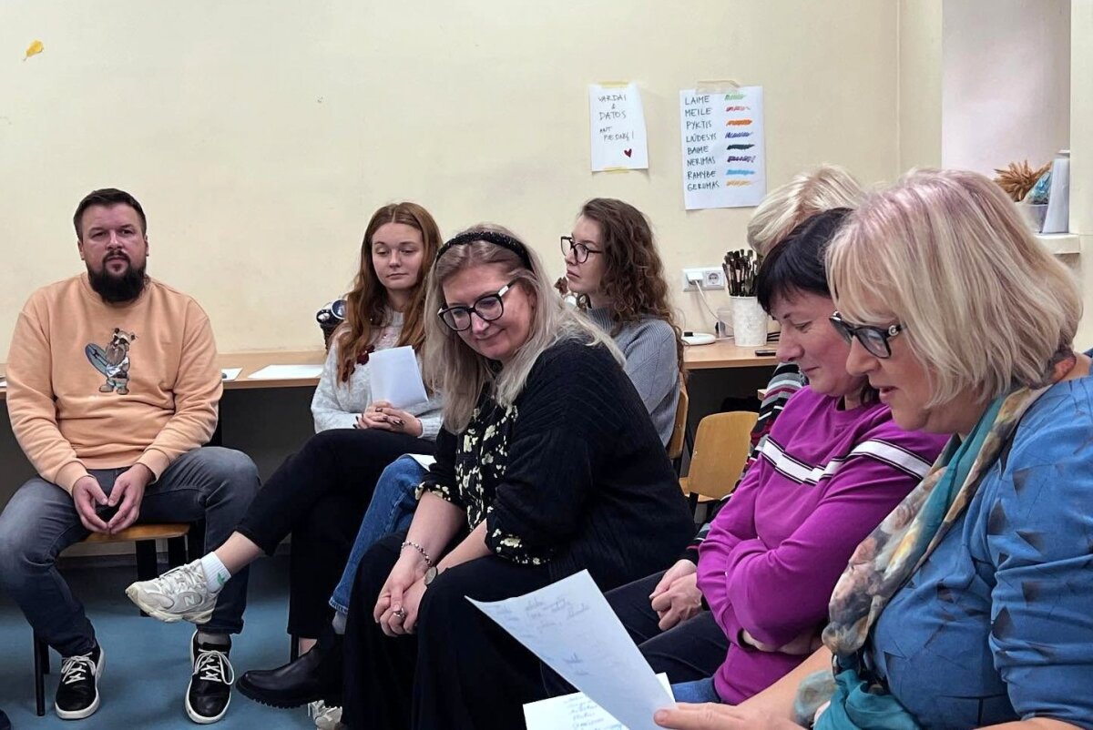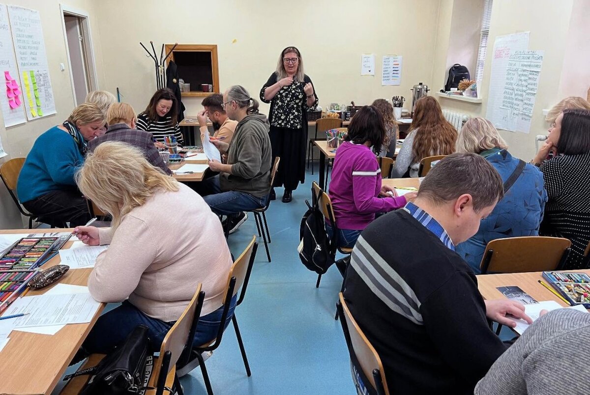 Socialinė darbuotoja Gitana pristatė kompleksinės pagalbos šeimai Panevėžio mieste paslaugas, dailės terapijos specialistė Vaida supažindino su gilumine dailės terapija ir pravedė dailės terapijos užsiėmimą.