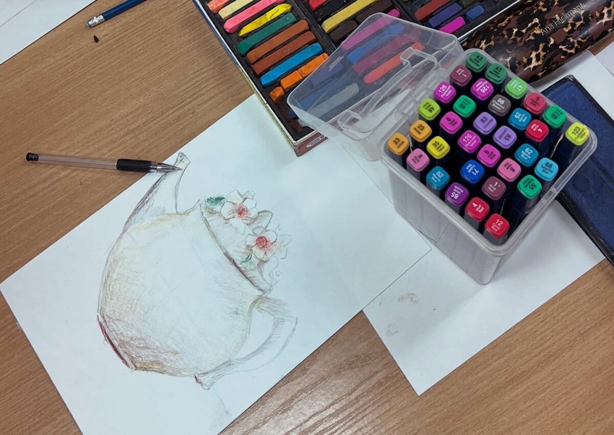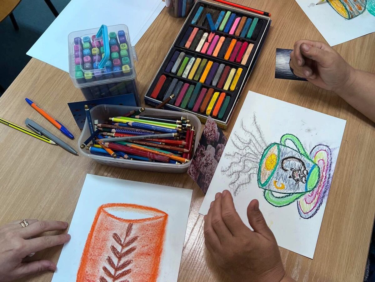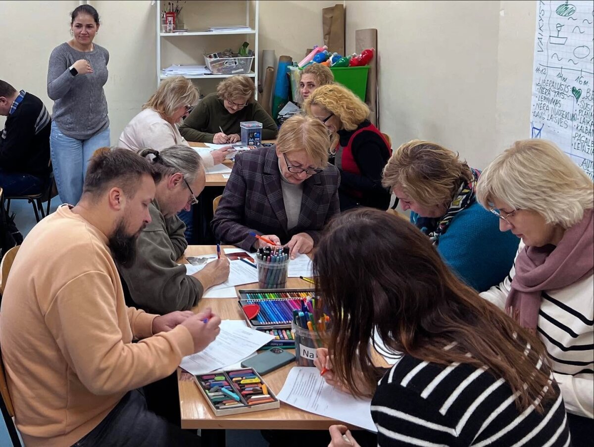 Socialinė darbuotoja Gitana pristatė kompleksinės pagalbos šeimai Panevėžio mieste paslaugas, dailės terapijos specialistė Vaida supažindino su gilumine dailės terapija ir pravedė dailės terapijos užsiėmimą.