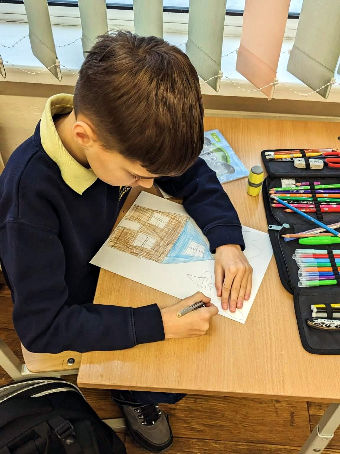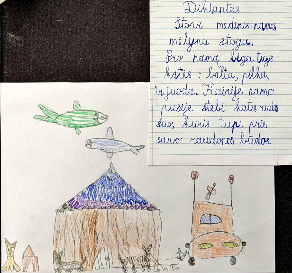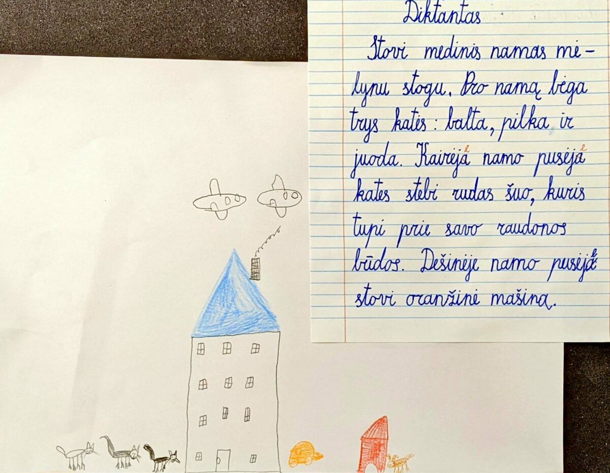 Tokio tipo diktantui svarbi kiekviena vaizdinė detalė. Pirmiausiai mokiniai parašė diktantą, po to savarankiškai dar kartą skaitė po sakinį ir piešė.