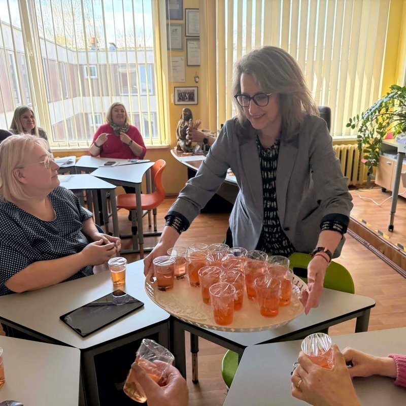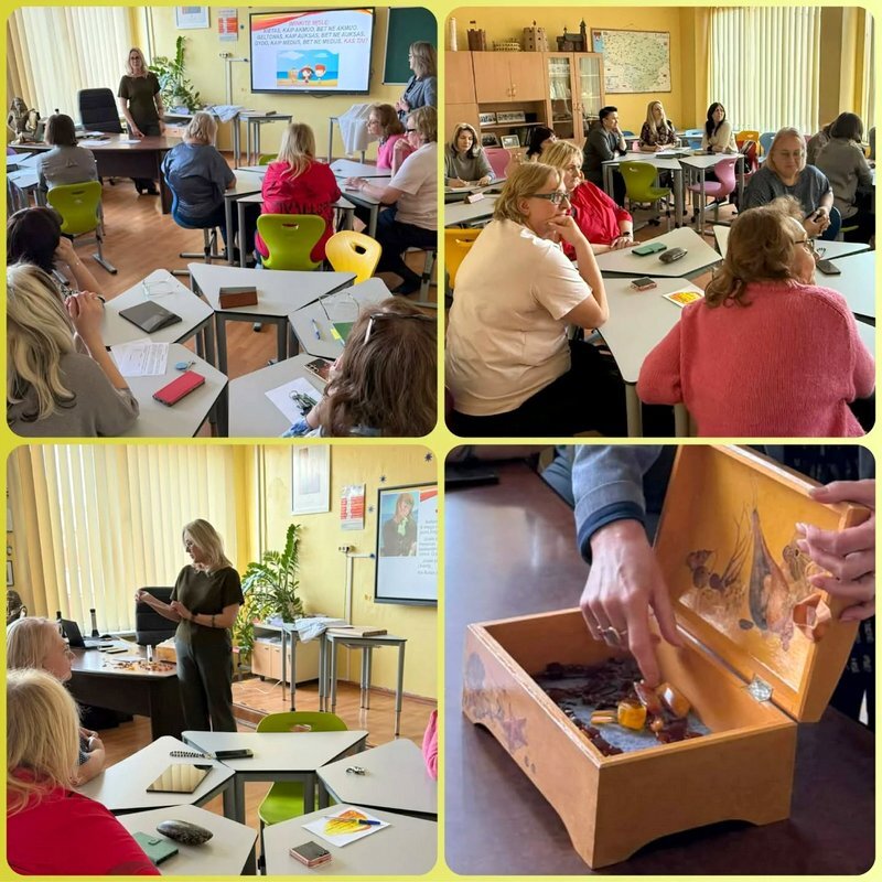 Logopedės Vilija ir Miglė pakvietė miesto mokytojus, švietimo pagalbos specialistus į 13-tos klasės pamoką ,,Gintaro laše – mano Lietuva“. Specialistės dalijosi patirtimi, kaip mokinius supažindinti su gintaro savybėmis, kilme ir kultūrine reikšme, ugdant teksto supratimo ir bendradarbiavimo gebėjimus.
