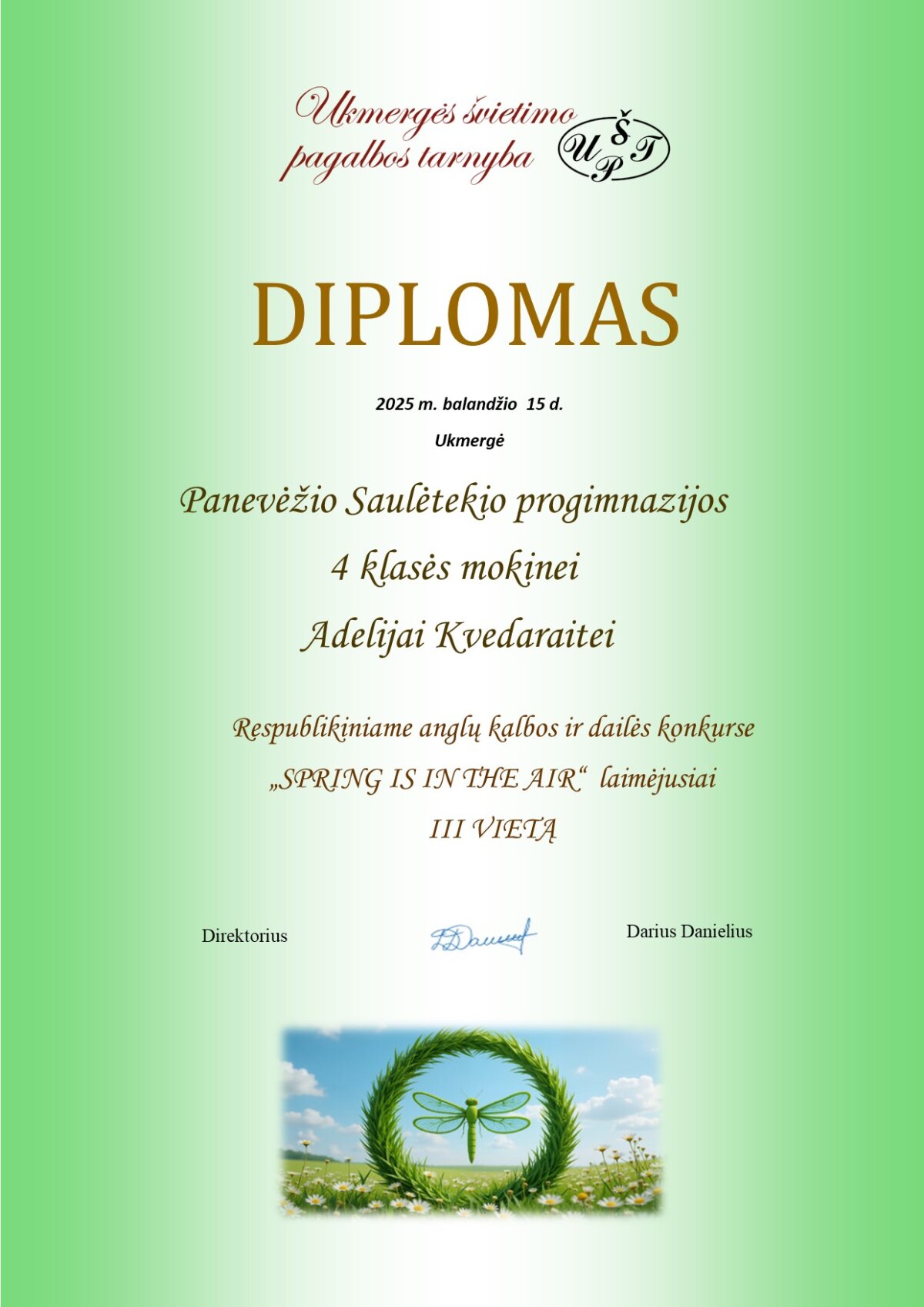 Kovo mėnesį mūsų mokyklos ketvirtos klasės mokiniai aktyviai dalyvavo Ukmergės švietimo pagalbos tarnybos ir Ukmergės Užupio bei Dukstynos pagrindinių mokyklų organizuotame respublikiniame 4 klasių mokinių anglų kalbos ir dailės konkurse „SPRING IS IN THE AIR“. Konkurse dalyvavo net 195 pradinukai iš įvairių Lietuvos miestų ir miestelių! Mokiniai kūrė spalvingus dailės darbus pavasario tema ir rašė jų aprašymus anglų kalba (10-12 sakinių). Sveikiname Adeliją K., 4d klasės mokinę, laimėjusią III vietą! (mokytoja I. Kaškelytė). Konkursui mokinius taip pat ruošė anglų kalbos mokytojos R. Medeckienė ir E. Šukienė. Nuoširdžiai dėkojame visiems dalyviams, džiaugiamės jų kūrybiškumu, pastangomis ir anglų kalbos gebėjimais. Konkurso dalyvių darbus galima pamatyti paspaudus šią nuorodą: