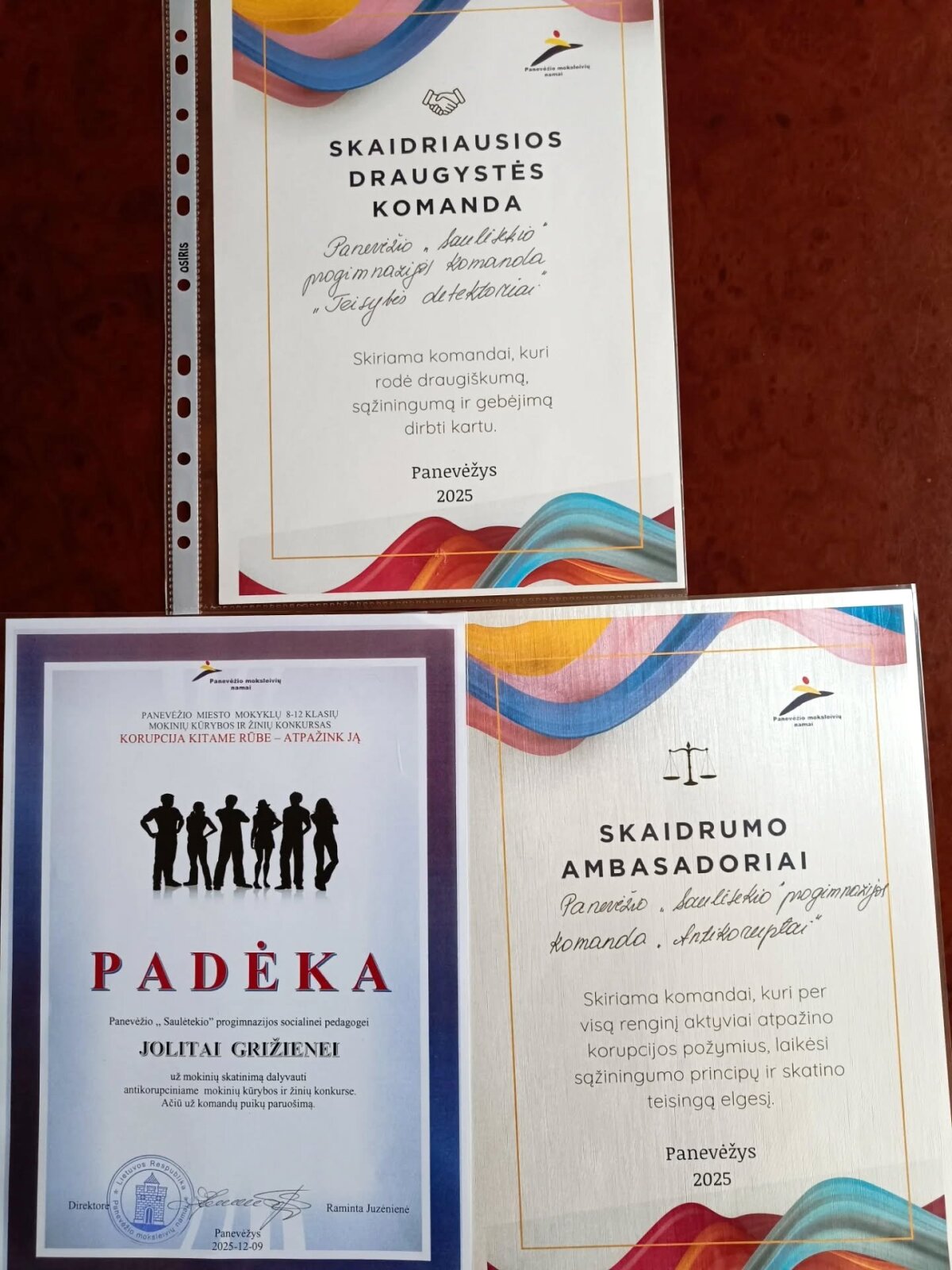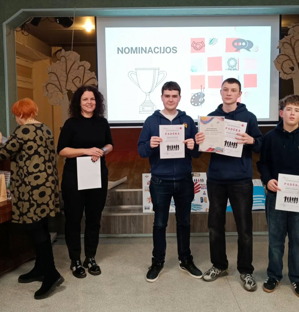Taip pat dėkojame 8b vaikinų – Audriaus, Mato, Jokūbo, Dovydo komandai „Antikoruptai“, kurie ryžtingai ir drąsiai komentavo korupcijos atvejus, puikiai suvaidino situacijas ir buvo nominuoti skaidrumo ambasadoriais.