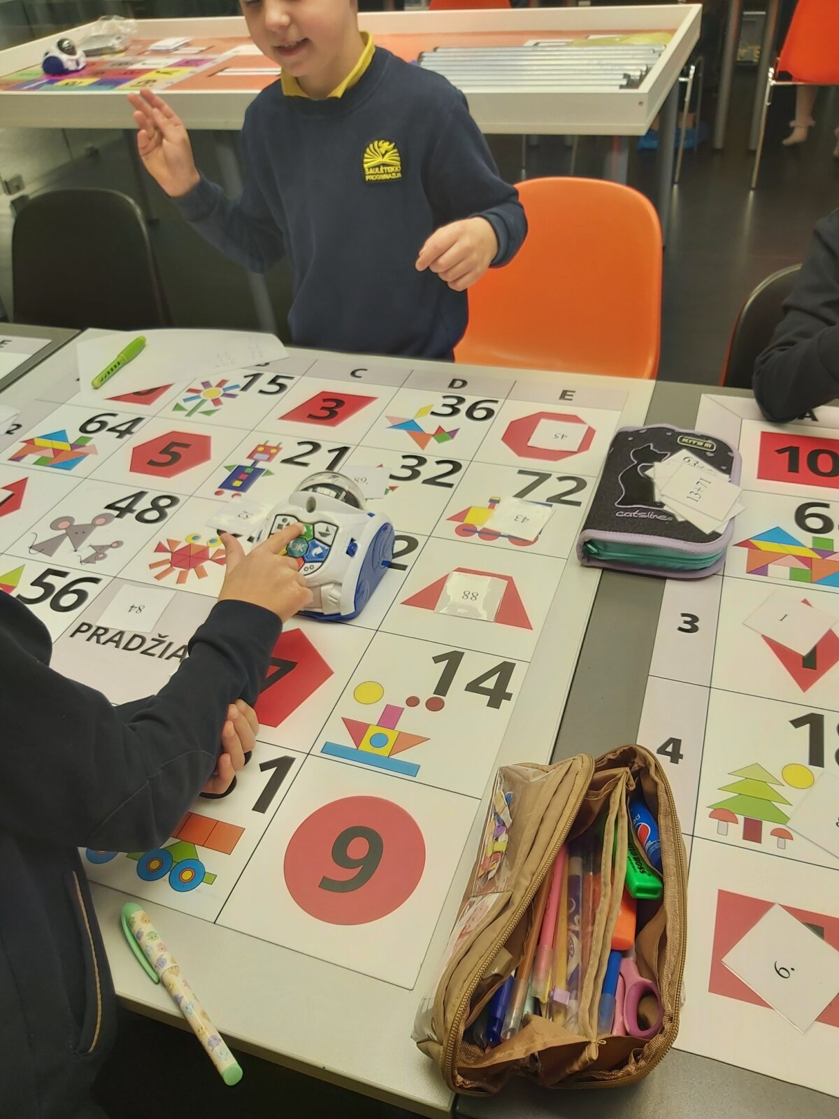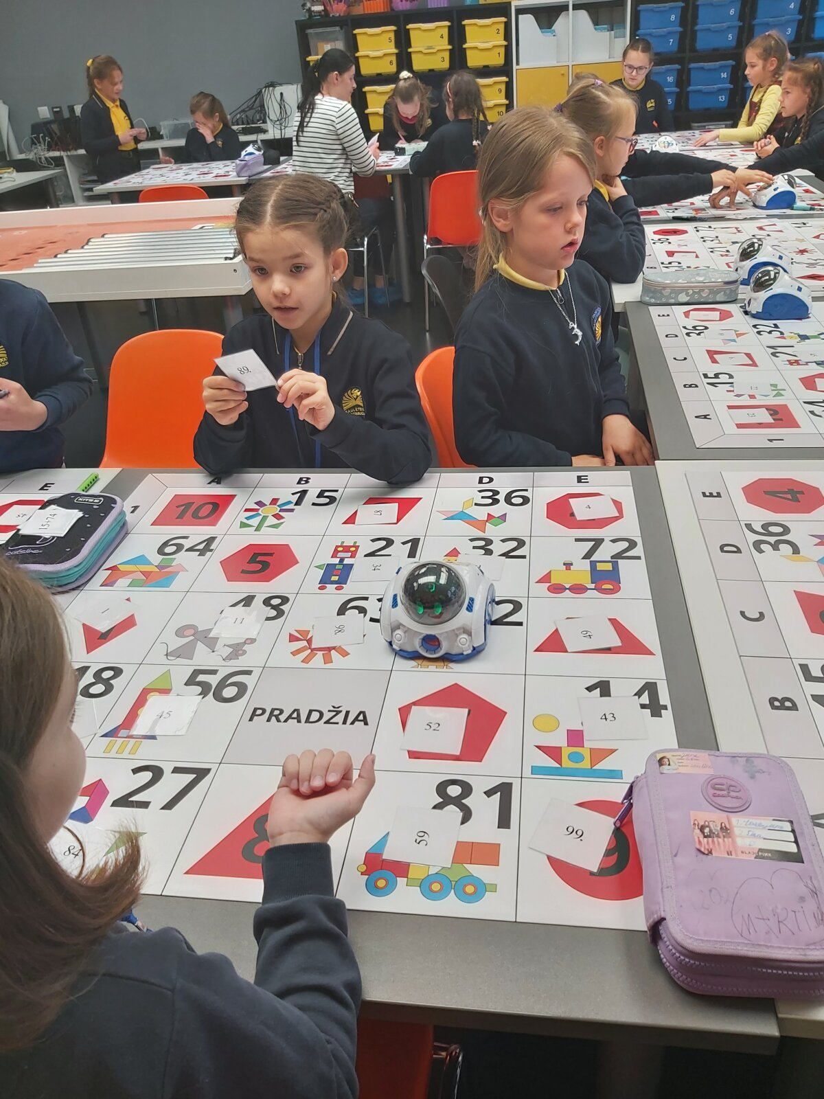 Gegužės 19 dieną 2b klasės mokiniai dalyvavo integruotoje matematikos ir informacinių technologijų pamokoje Panevėžio robotikos centre „RoboLabas“. Vaikai susipažino su robotukų veikimo principais, išsiaiškino mygtukų reikšmes. Mokiniai individualų darbą derino su darbu poromis. Įtvirtino dviženklių skaičių sudėties ir atimties įgūdžius. Suprogramavo Mind Designer robotukus, kad šie nuvažiuotų prie kortelės su atsakymu. Pamoka ne tik gerino skaičiavimo įgūdžius, bet ir skatino kūrybiškumą, bendradarbiavimą bei domėjimąsi technologijomis.