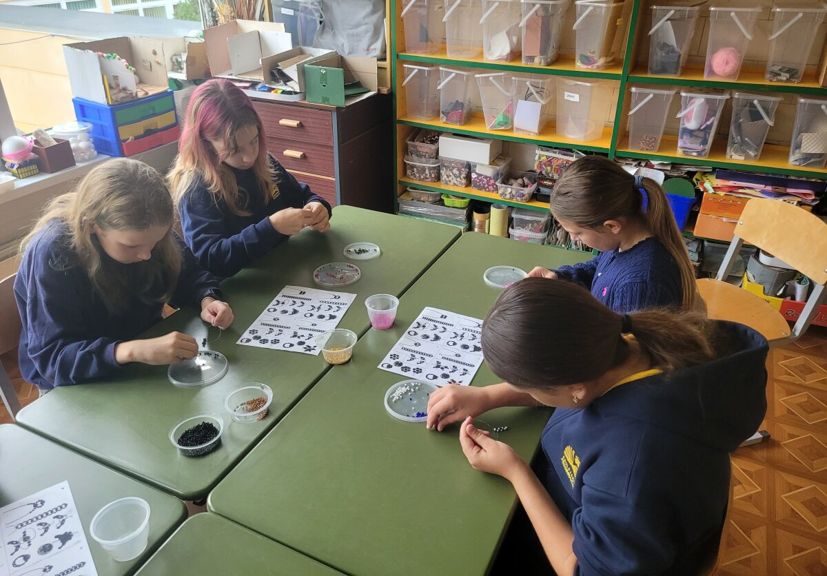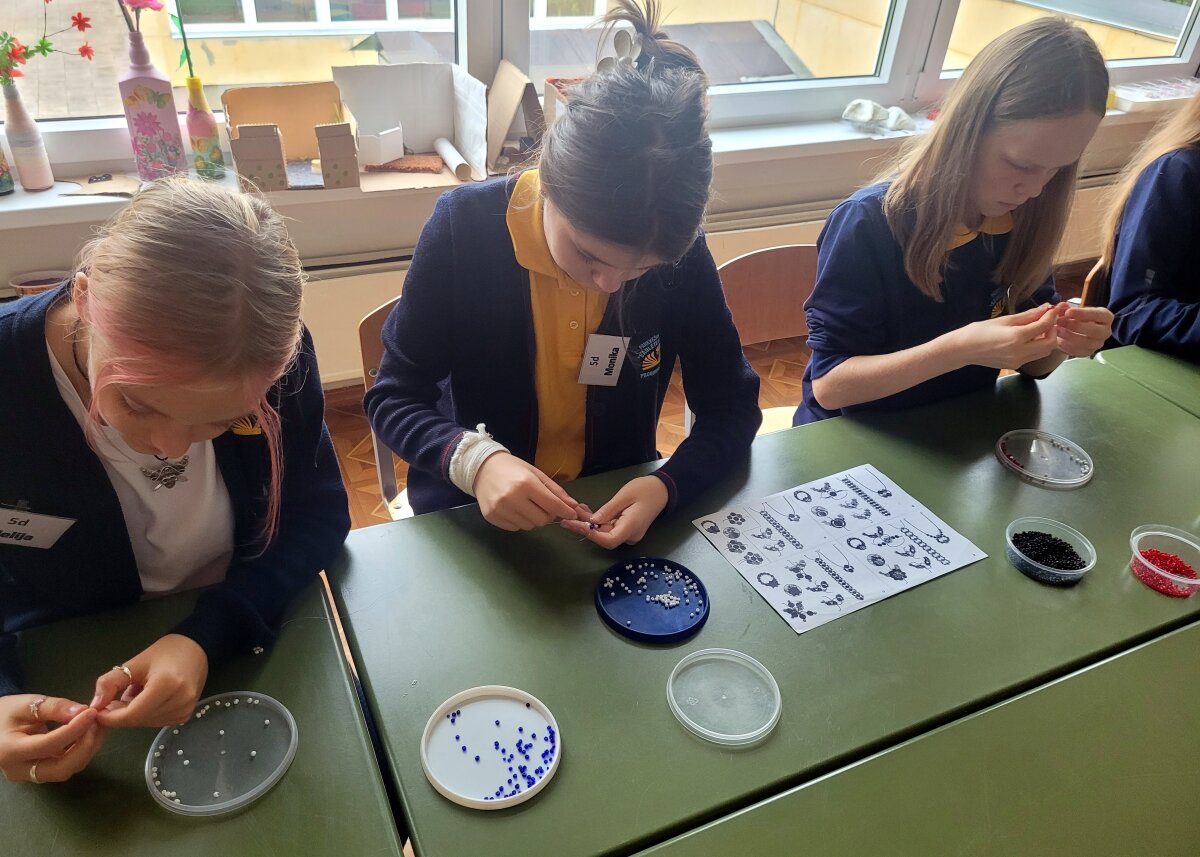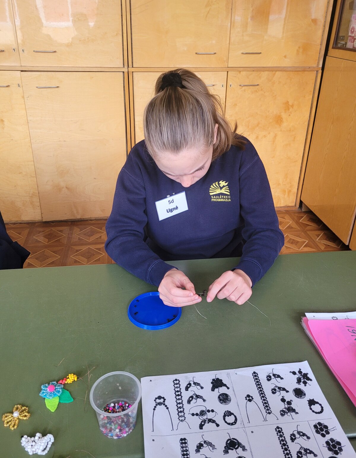 Edukacijos „Dailieji amatai“ metu mergaitės susipažino su karoliukų vėrimo technika, sužinojo jos atsiradimo istoriją ir pačios pasigamino po žieduką.