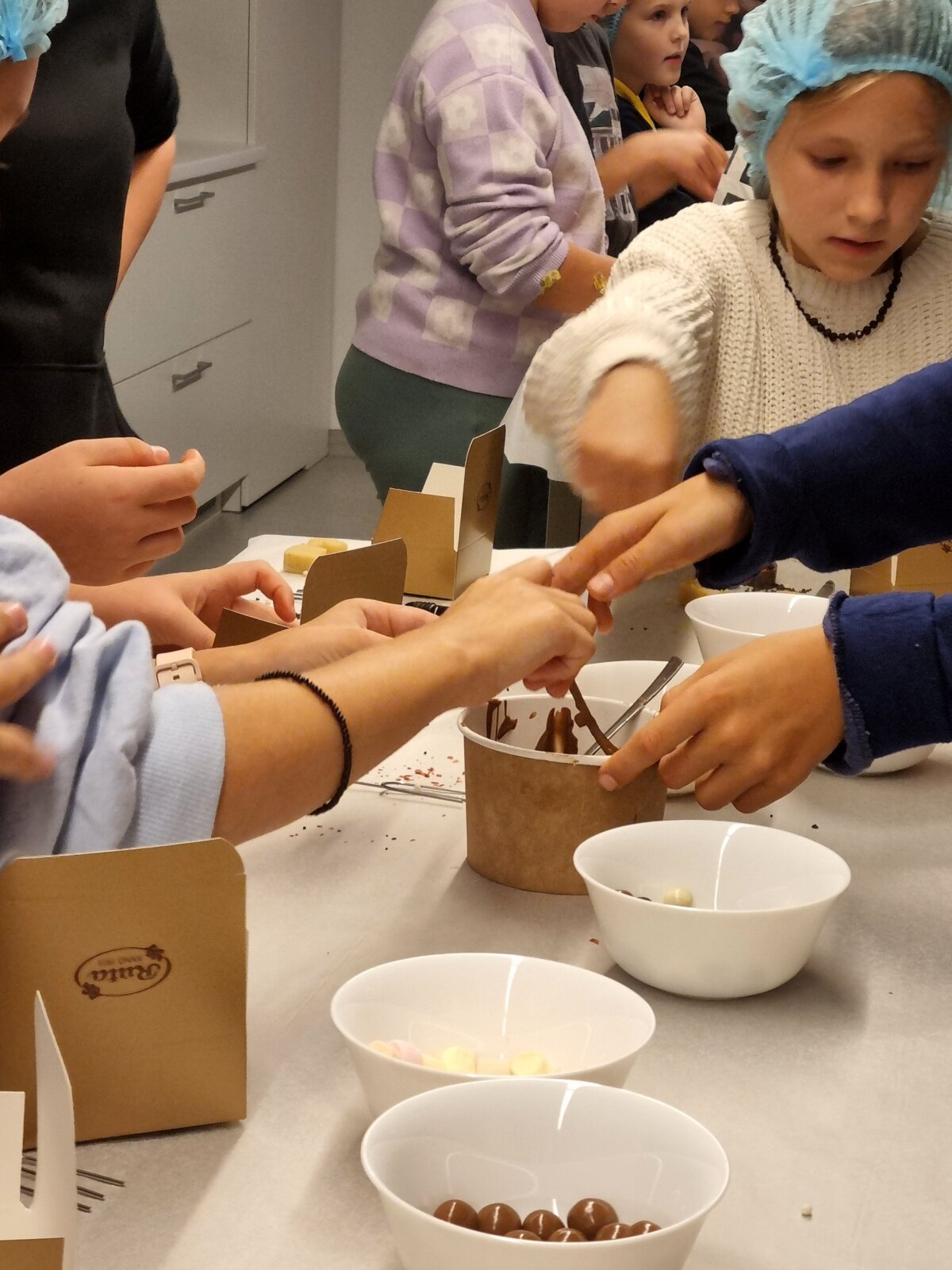 4b ir 4c klasių mokiniai lankėsi šokolado fabrike, kur dalyvavo edukacijoje apie šokolado istoriją ir gamybą. Vaikai sužinojo, kaip iš kakavos pupelių atsiranda šokoladas, ir patys, laikydamiesi instrukcijų, gamino šokoladinius saldainius bei susipažino su maisto technologo profesija.