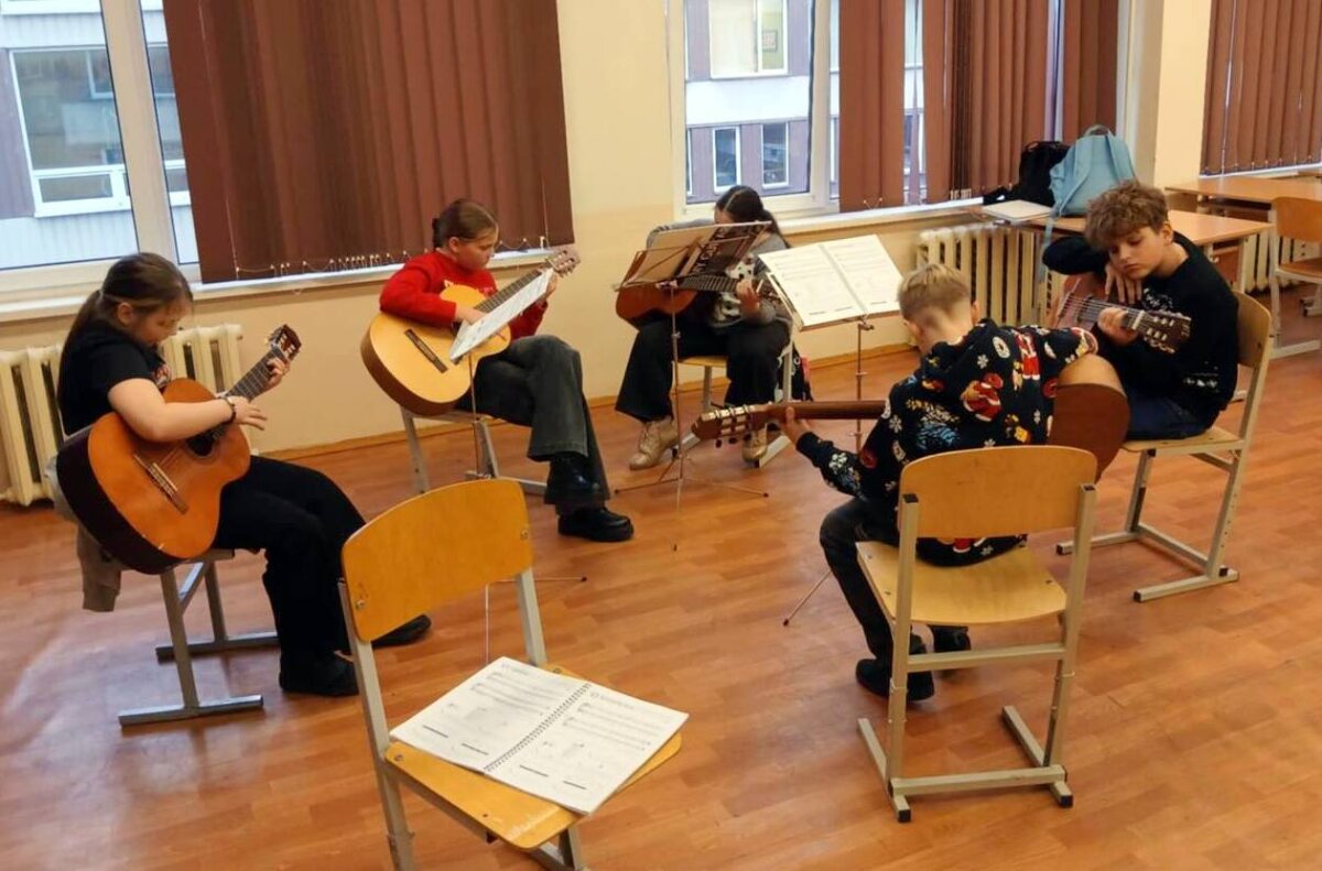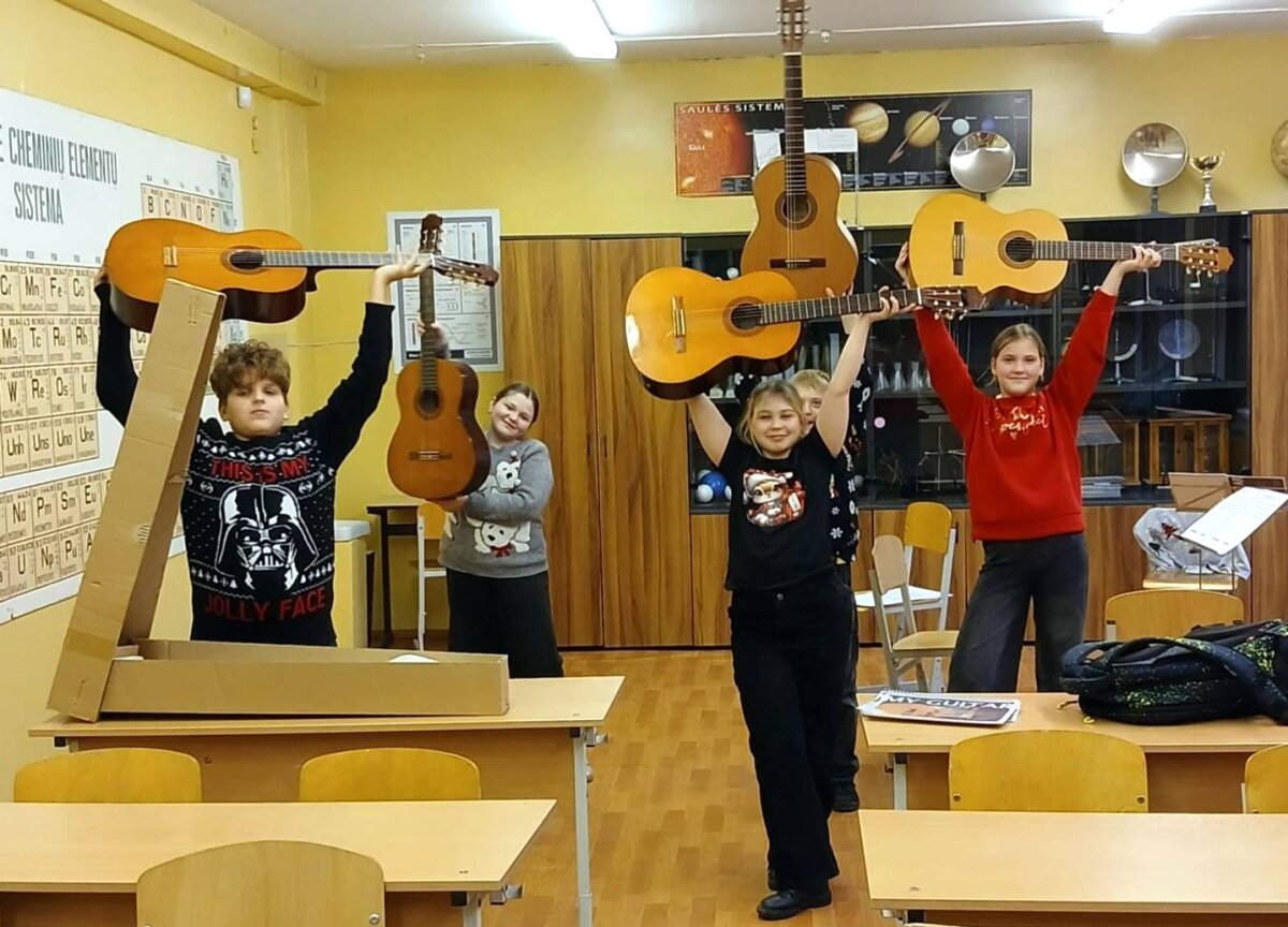 Kūrybinių dirbtuvių metu mokiniai mokosi groti akustinėmis gitaromis. Laukiam koncerto!