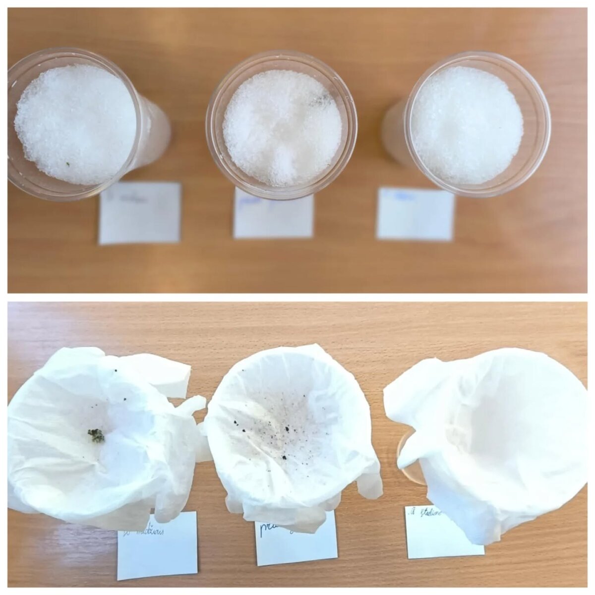 Tyrinėjome sniego užterštumą. Mokiniai kėlė hipotezes ir tirpino sniegą, surinktą iš skirtingų vietų: stadiono, iš po medžių ir prie gatvės. Filtruodami ištirpusį vandenį, jie pastebėjo ant filtro likusias daleles ir padarė išvadą, kad sniegas gali būti užterštas ir sugeria nešvarumus iš aplinkos.