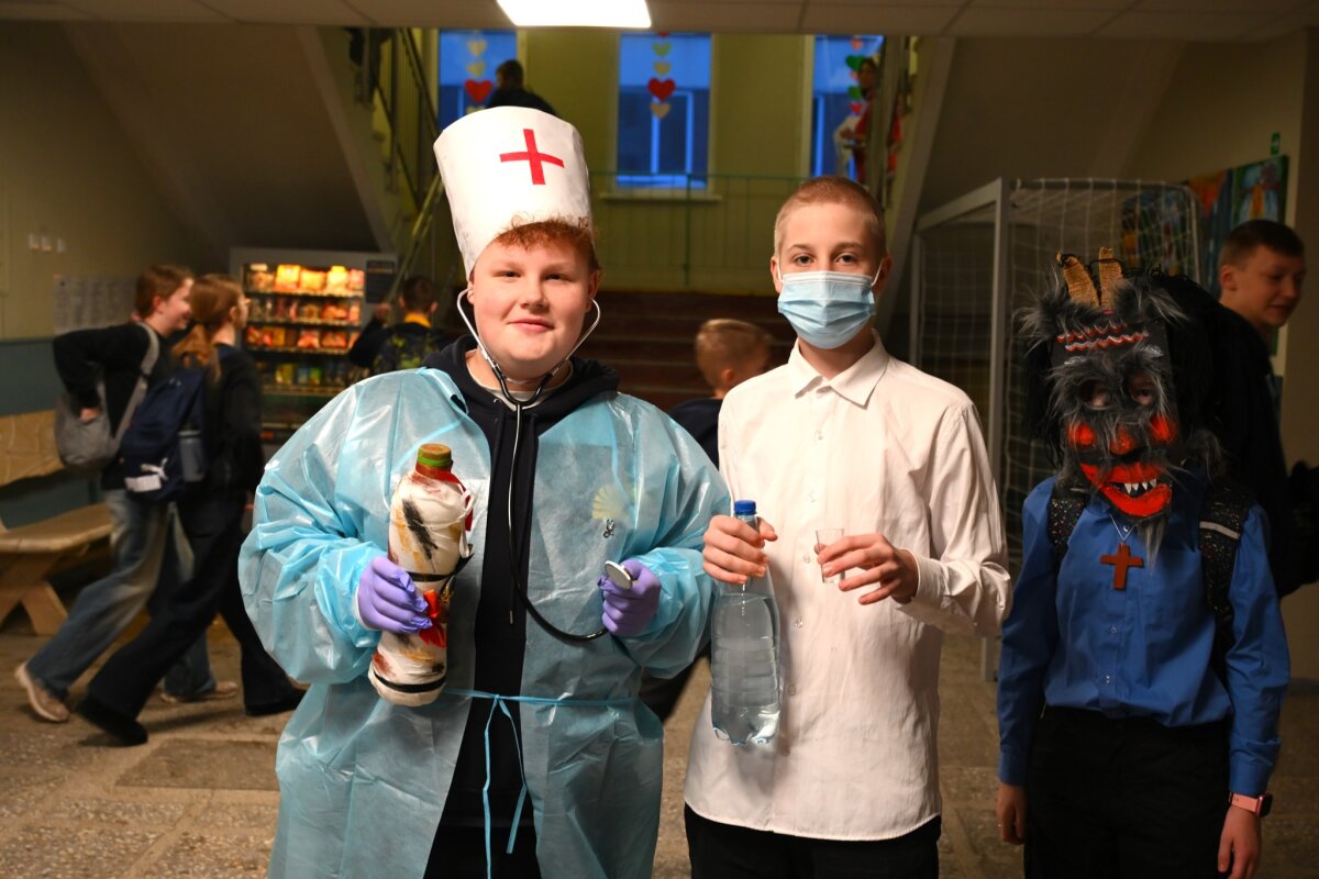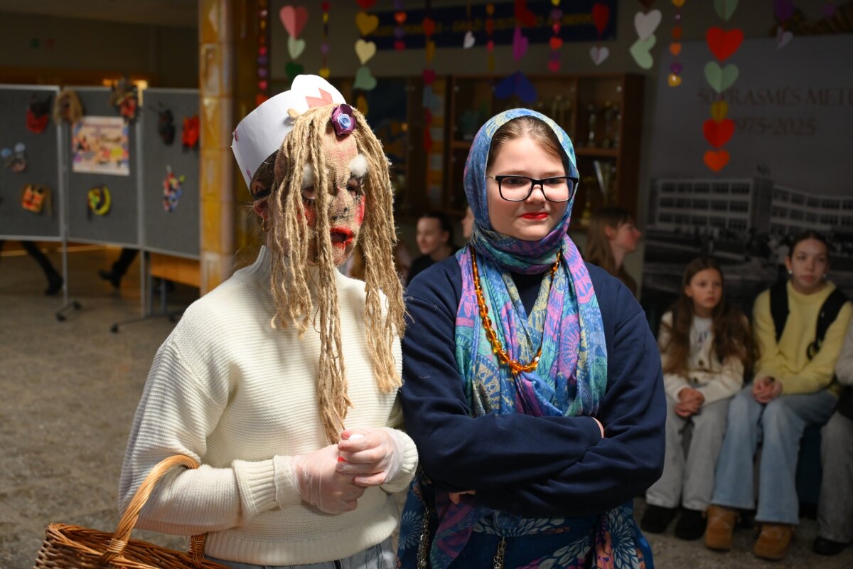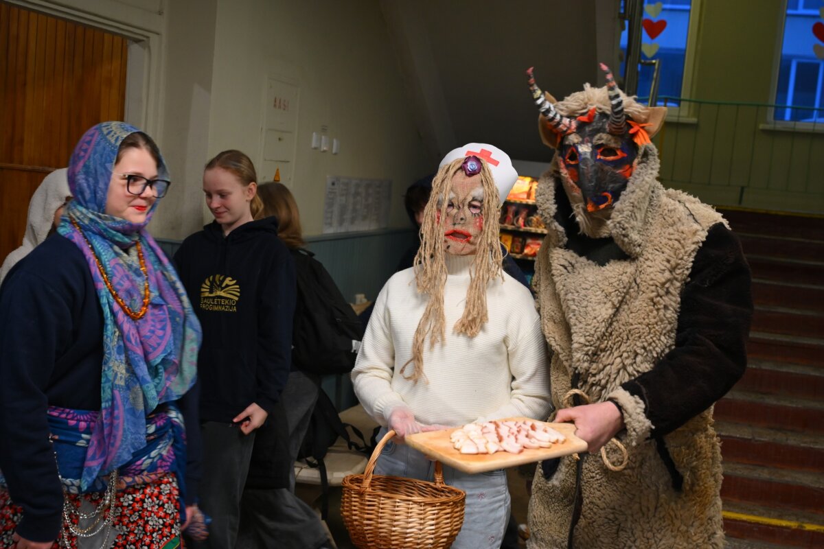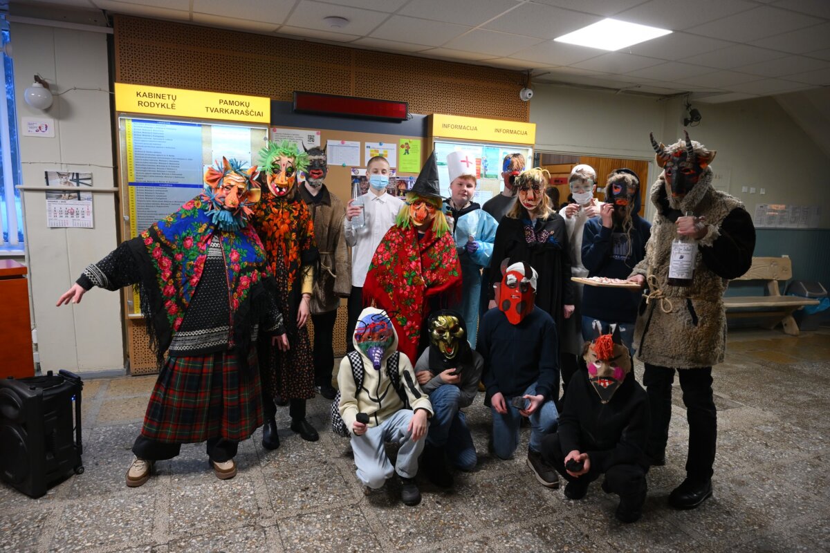 Nuo pat ryto mokykloje šurmuliuoja Užgavėnės! Koridoriuose – gausybė personažų ir persirengėlių. Atvykstančius mokinius bei mokytojus pasitinka muzika, šypsenos ir vaišės. Gera nuotaika prasideda nuo pat slenksčio ir tikimės, kad lydės visą dieną.